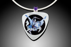 2017 recipient, Sandra McEwen, had this to say about receiving the scholarship: “I was honored to receive the Don H. Johnson Scholarship Award in 2017. Although I never met Don, his family was gracious, kind and enthusiastic about my work—It was such a pleasure to meet them and hear stories about Don! The award itself was a welcome addition, and I used the funds to travel to meet other enamel artists, as well as to purchase some equipment to make educational videos on enameling. Don’s generosity has inspired me to share my knowledge of enameling and I hope to pay it forward some day!” Pictured here is her necklace, entitled Perseus.