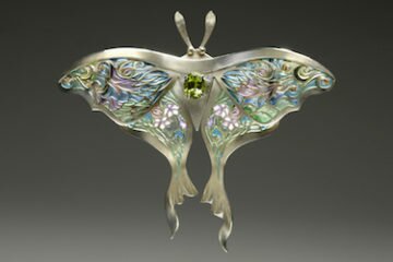 Linda loved this use of translucent enamel popularized by master jewelers such as René Lalique during the Art Nouveau Era and was determined to figure out a way to do it successfully. She did. Instead of using the glass enamel she figured out a way to use a more durable resin utilizing the same surface tension technique. The resin is placed in hand pierced cells instead of wires which makes the piece more structural sound. Now these beautiful works of art can be worn or displayed as art and enjoyed without the fear of breakage. Linda successfully reintroduced an old art form made new in her jewelry.
