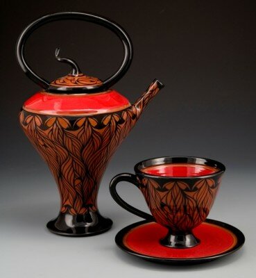 As a full time studio potter since 1995, Marti is a clay artist working in Staunton, Virginia. Her teapots, bowls, cups and saucers, plates, vases and lidded jars are wheel thrown and hand painted with layers of underglazes on Georgia red clay.